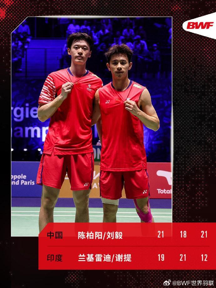 8月31日,世锦赛男双半决赛:陈柏阳/刘毅2-1(21-19、18-21、21-12)战胜兰基雷迪/谢提,首次参加世锦赛即进决赛。国羽时隔14年打进世锦赛全部5个单项的决赛,上一次是2011年伦敦世锦赛。